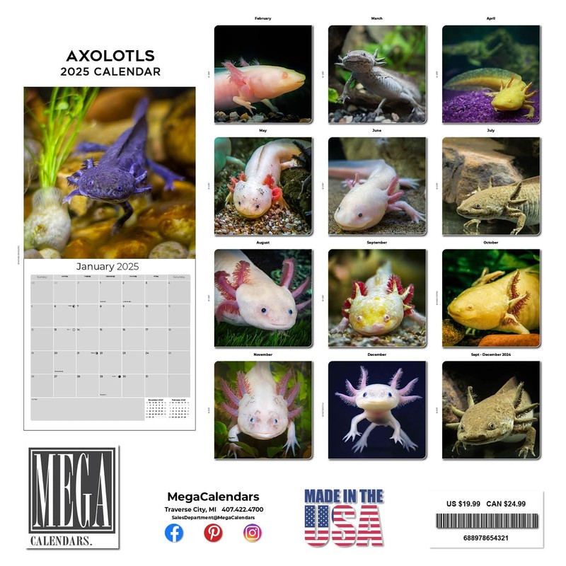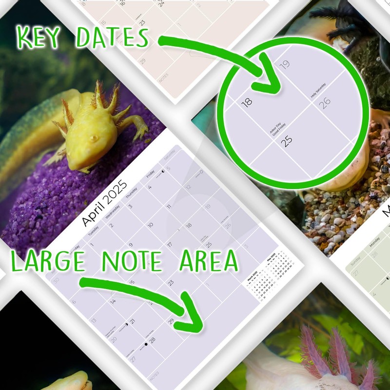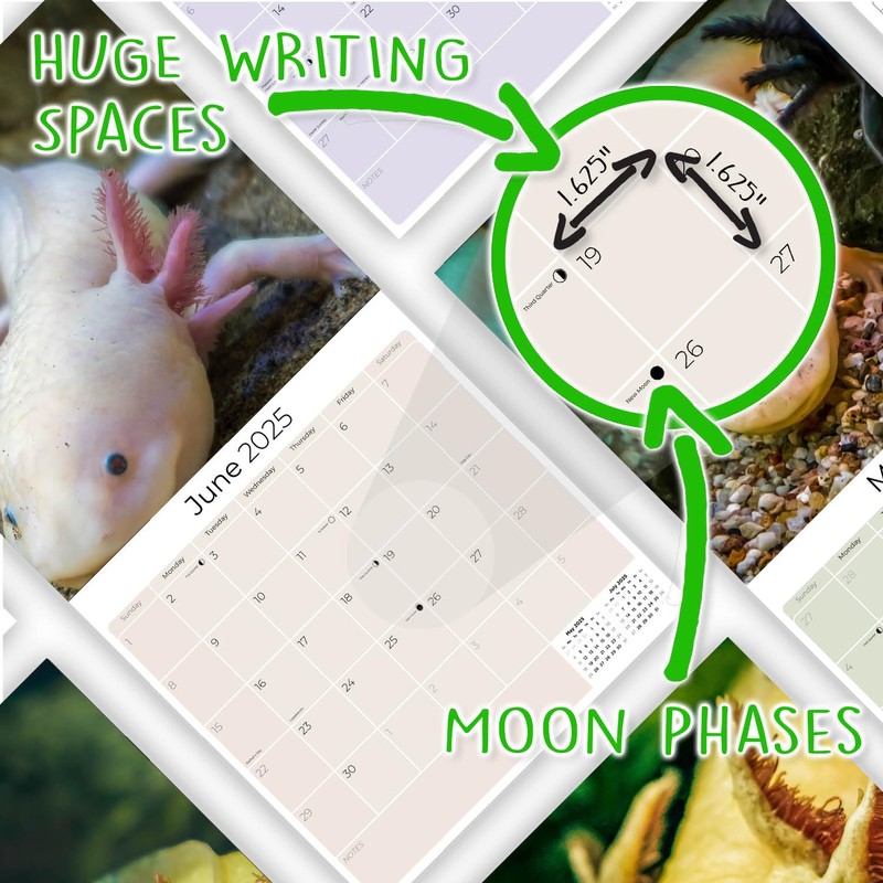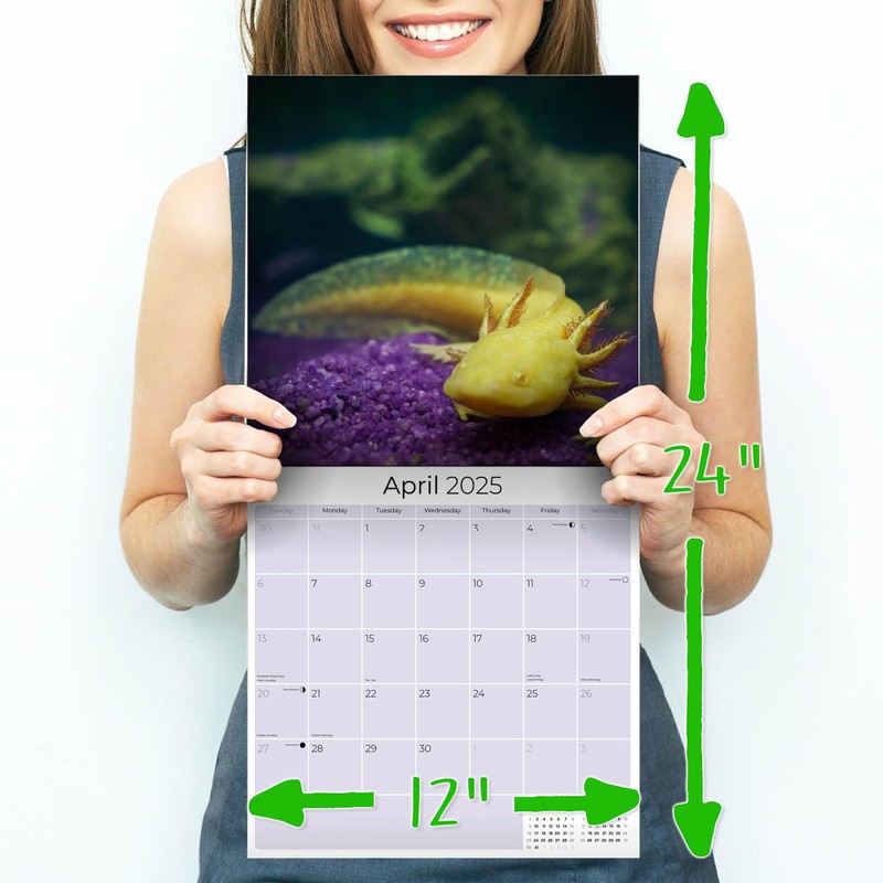 - PREMIUM PAPER - Each of our small batch Axolotyl calendars runs uses the thickest paper in their class. Our artisans produce these premium BONUS month 2025 Axolotyl calendars with high-definition Axolotyl images and print them right here in the U.S.A. using the highest quality inks and environmentally friendly American paper from responsible sources.