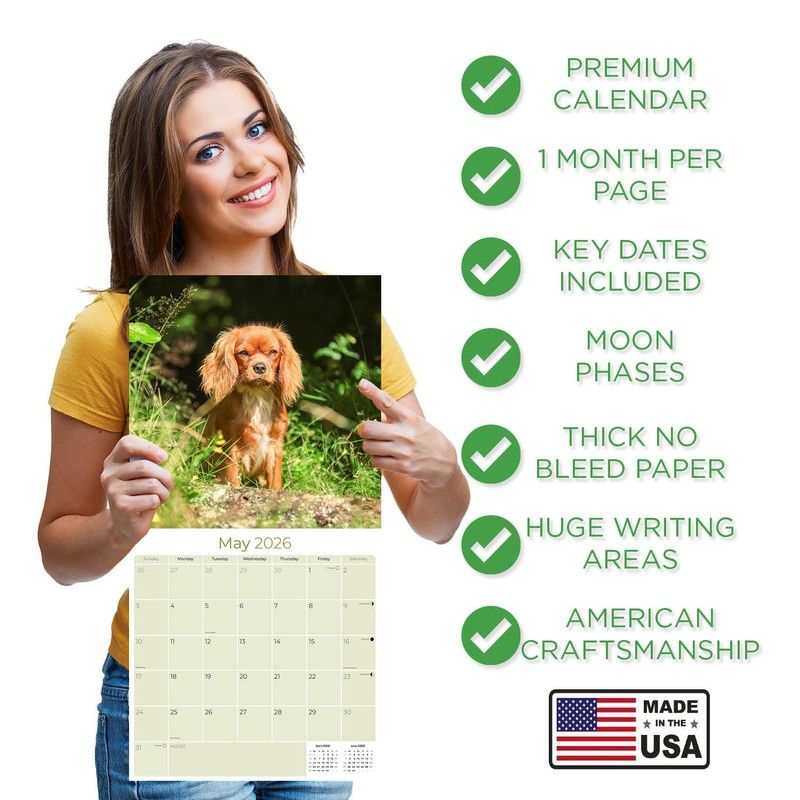 - PREMIUM PAPER - Each of our small batch Cavalier King Charles calendars runs uses the thickest paper in their class. Our artisans produce these premium BONUS month 2025 Cavalier King Charles calendars with high-definition Cavalier King Charles images and print them right here in the U.S.A. using the highest quality inks and environmentally friendly American paper from responsible sources.