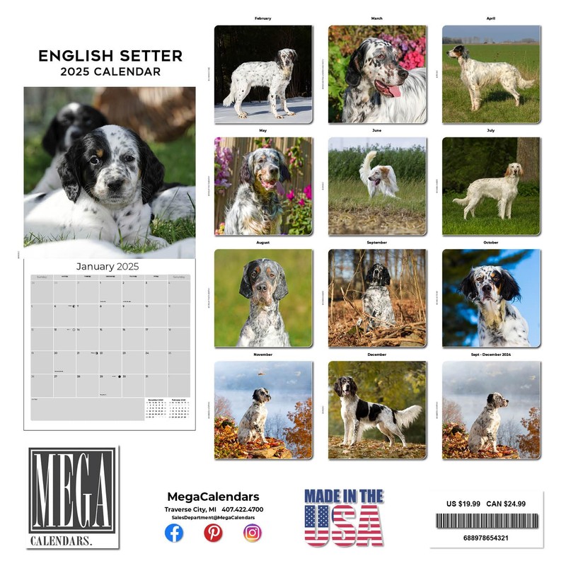 - The original English Setter dog breed calendar! MADE IN THE USA WITH PROFESSIONAL CONTENT DESIGN AND PHOTOGRAPHY - Featuring the best English Setter photographers on the planet. Each of the monthly pages contains past and future referencing dates to plan and track your monthly goals + Bonus months calendar for your long-term strategy and planning.