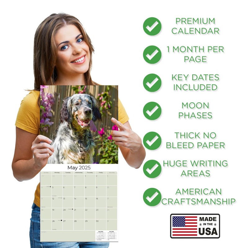- PREMIUM PAPER - Each of our small batch English Setter calendars runs uses the thickest paper in their class. Our artisans produce these premium BONUS month 2025 English Setter calendars with high-definition English Setter images and print them right here in the U.S.A. using the highest quality inks and environmentally friendly American paper from responsible sources.