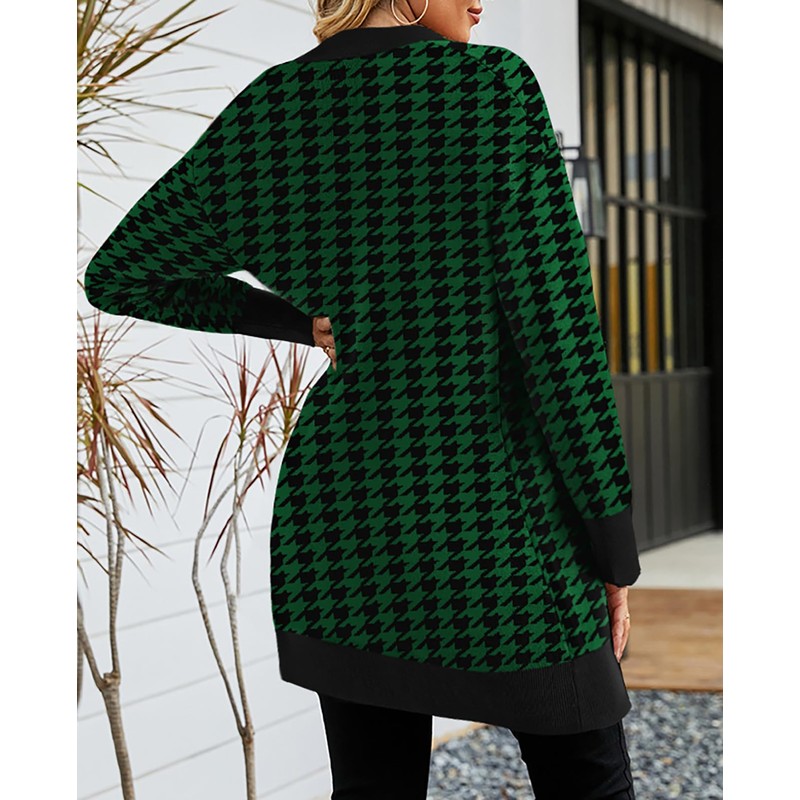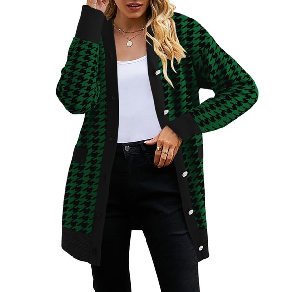 2024 Fall Casual Long Cardigan for Women Houndstooth Long Sleeve Open Front Button Down V Neck Cardigans Sweater Dress Green S