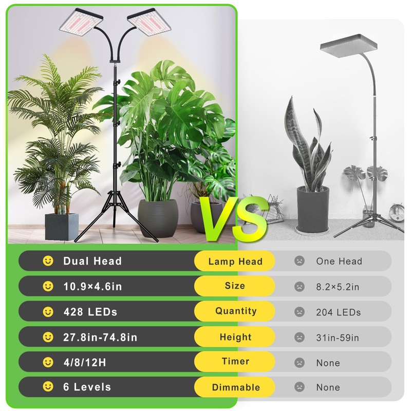 2024 LBW Latest Grow Light for Indoor Plants, 428 LED Dual-Head Full Spectrum Standing Plant Light, Floor Grow Lamp with 3/6/12H Timer, 6 Brightness Levels, 3 Switch Modes, 75" Adjustable Tripod Stand