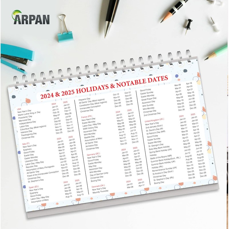 - Start from 1st January 2024 to 31st December 2024 - Calendar Included: 2024-2025 Calendar, One Page for Useful Numbers - 2024 Holidays & Notable Dates Including UK, USA, Italy, Germany, France, Spain, Denmark - Two Page for Budget At Back.