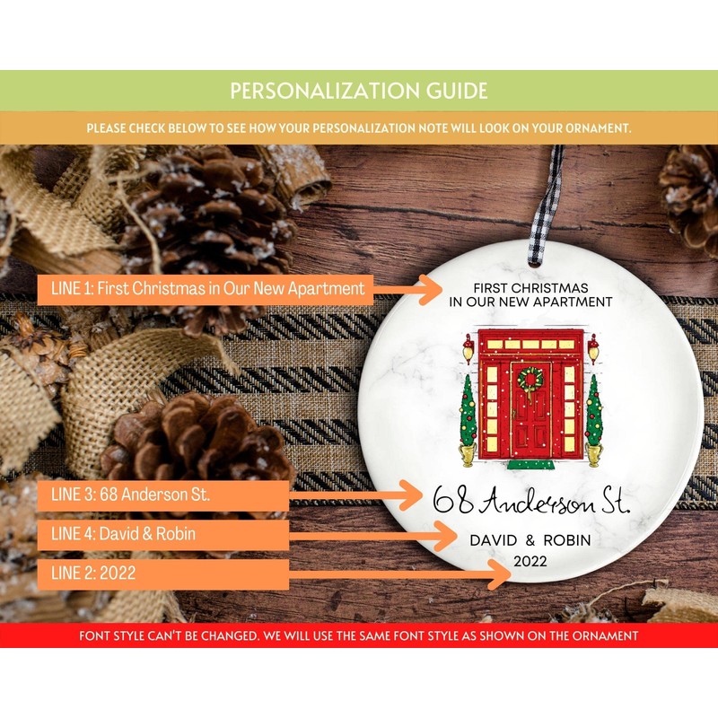 • Celebrate the Magic of Our First Christmas in Our New Apartment: Commemorate the joyous occasion of spending your first holiday season in your new home with our enchanting personalized "Our First Christmas in Our New Apartment" ornament—a delightful decoration adorned with a charming red door in a Christmas time design that marks this special milestone.