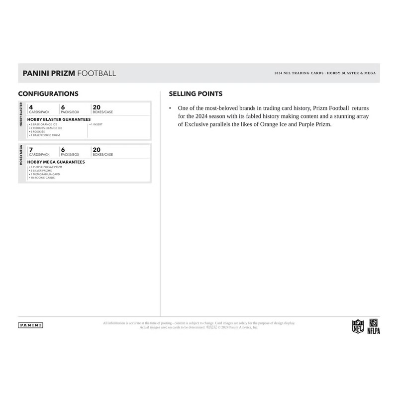 One of the most-beloved brands in trading card history, Prizm Football returns for the 2024 season with its fabled history making content and a stunning array of Exclusive parallels the likes of Orange Ice and Purple Prizm.