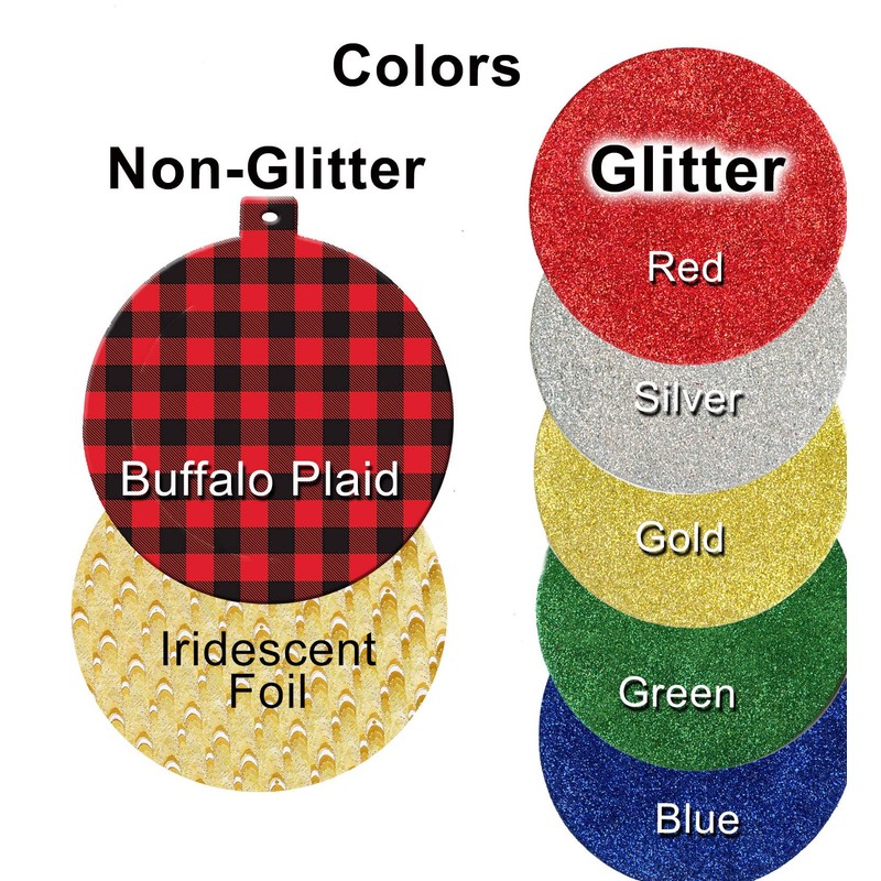 • Decorate Your Tree in any of 5 colors: Silver, Red, Green, Gold or Blue..all in GLITTER. Also available in NON-Glitter is the Iridescent Foil and Red & Black Buffalo Plaid designs. Each picture frame ornament includes a matching satin ribbon for hanging plus a special date charm to create a memory ornament keepsake.