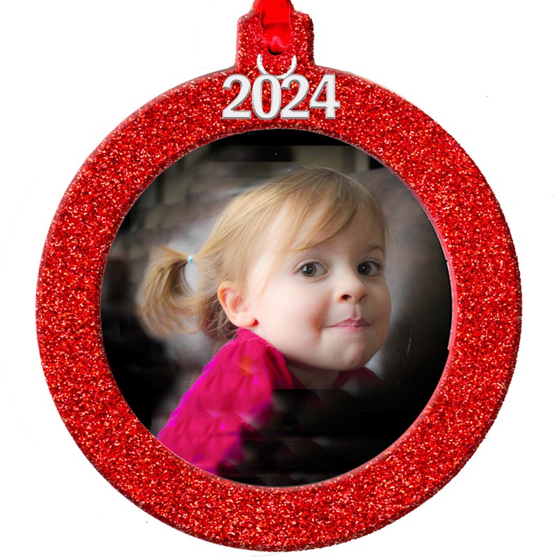 2024 Photo Ornaments for Christmas Tree, Sparkly Glitter Christmas Frame Ornament, Easy-Load Magnetic Design, Includes Satin Ribbon with Silver Charm Plus Photo Protector, Round, Red