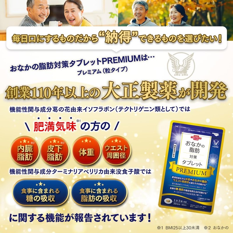 【2024 新登場】大正製薬 「機能性表示食品」 おなかの脂肪対策タブレットPREMIUM [ おなかの脂肪 葛の花イソフラボン ターミナリアベリリカ 糖や脂肪 体重 サプリ ] 90粒/1袋