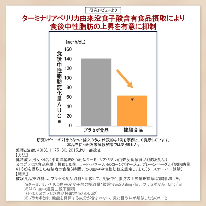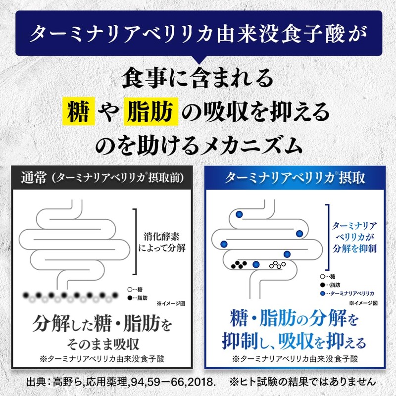 - 💡[ <ターミナリアベリリカ由来没食子酸>を配合 ]<ターミナリアベリリカ由来没食子酸>は落葉樹「ターミナリアアベリリカ」の果実から抽出した機能性素材で、ポリフェノールを豊富に含有しています。「食事の 脂肪 や糖の吸収を抑えるのを助ける」という機能が期待されている成分です。