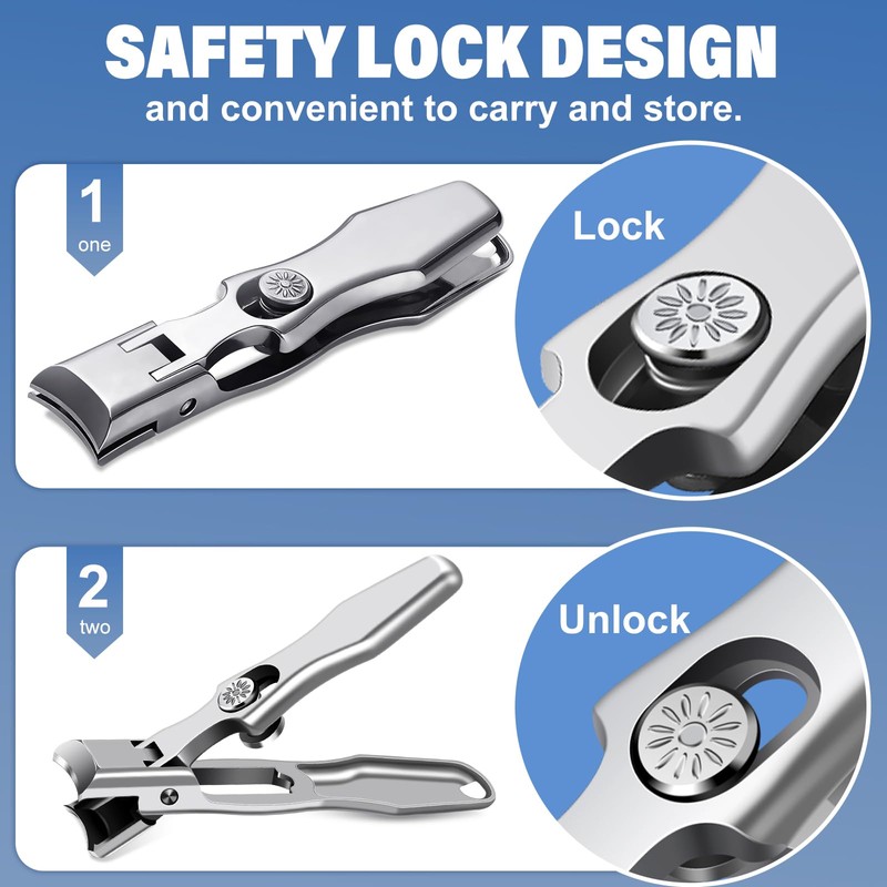 - 🔒【 Safety Lock & Mess Free Nail Clippers Design】: Large toe nail clippers for thick toenails, up to 12mm (0.47in) opening for thick fingernails and toenails. In addition, anti splash nail clippers design to prevent nails from splashing everywhere in process of nails clipping. The finger nail clippers adult is wide jaw opening and extremely sharp, so built with a safety lock, push the slide lock into the safe position when you do not use it.