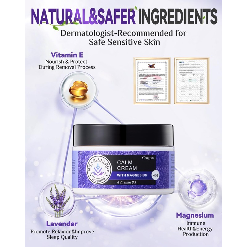 - 【2024 Natural & Organic Formula】Our calm cream with magnesium and vitamin d3 contains skin nourishing Oat Seed,Vitamin D3, Mango Seed Oil and other active ingredients that instantly calms dry and sensitive skin, quickly penetrates into the underlying layers of the skin, boosts skin's moisturization level, soothes skin's allergic reactions, maintains skin's balance and vitality, and strengthens the skin barrier.