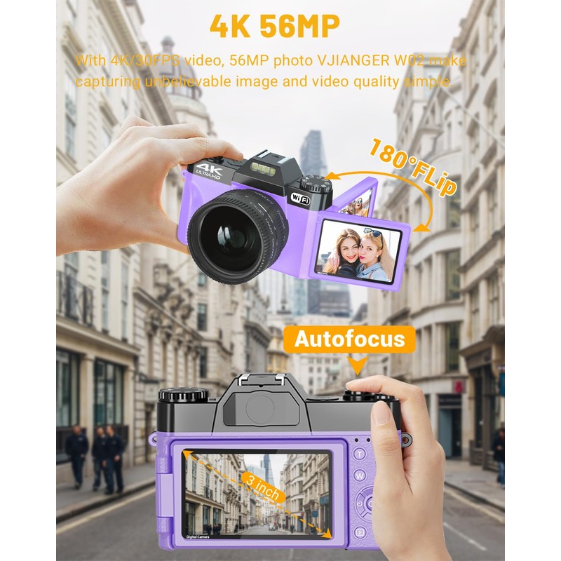 2024 Upgrade VJIANGER Digital Camera for Photography Vlogging Camera for YouTube with WiFi, 180° Flip Screen, 16X Digital Zoom, 52mm Lens, 2 Batteries, 32GB Micro SD Card(Purple)