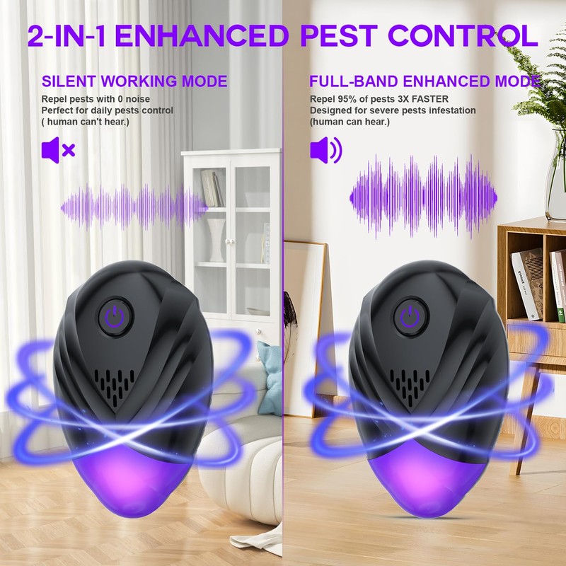 - Enhanced ultrasonic Control : Utilizing an upgraded micro-sensing chip and 60 segments/s of changing ultrasonic waves, this repeller effectively irritates pests' nervous systems, making them uncomfortable and unable to adapt.