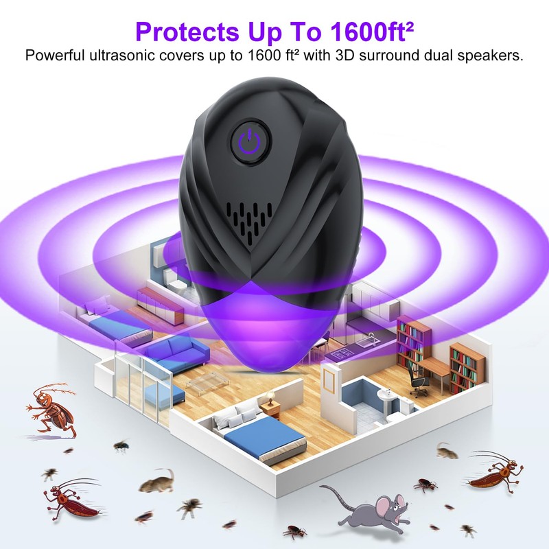- Expanded Protection Area: With advanced dual speakers and 3D surround sound, this device can create a 1600ft² zone of protection against pests - a 60% increase from the original version. The ultrasound waves spread in all directions for comprehensive coverage.