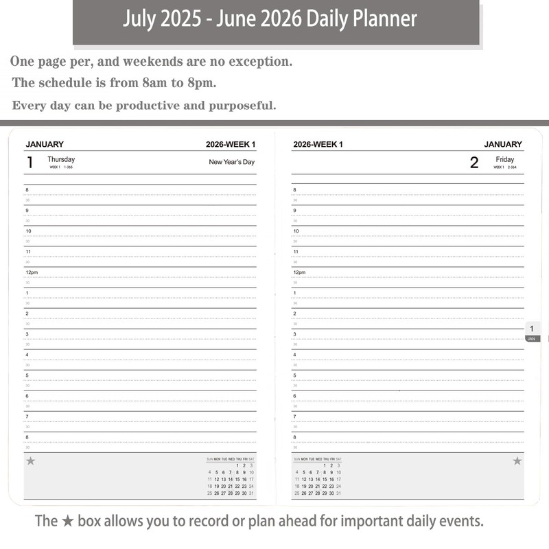 - 2025-2026 Academic Planner: Calendar daily schedule throughout the year is from 8:00 a.m. to 8:00 p.m. Each page is designed with a notes section, giving us plenty of room to plan each day. Comes with a 12-month monthly plan so you can plan monthly goals and important events. It is also a great Appointment Book!