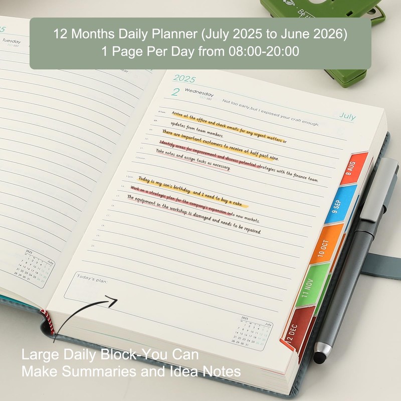 • Great Value:Academic Diary 2025-2026 runs from July 2025 till June 2026. 200 sheets/400 pages 2025-2026 Diary A5 Page a Day. one day per page hourly schedules from 7: 00 a.m. to 20: 00 p.m.Saturday and Sunday on one Page,you'll have ample space to plan your days, take notes, and stay on top of your tasks.and The Plan makes your busy daily routines organized.