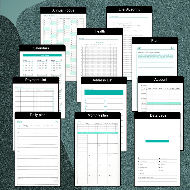 • Other Functional Pages: Personal DATA,Calendar 2025&2026,Yearly Planner,Life Blueprint,Health,Account,Payment List,Address List,Monthly Planner Detail:The most critical things of this month,Plans for studying,Travelling Plan,Health and fitness Plan,Financial Plan. with this gorgeous diary 2025-2026, help you Organize your life in style, and Live your life more consciously and make your everyday life more positive!