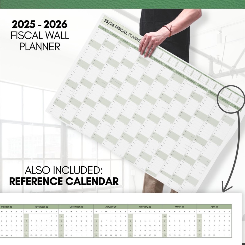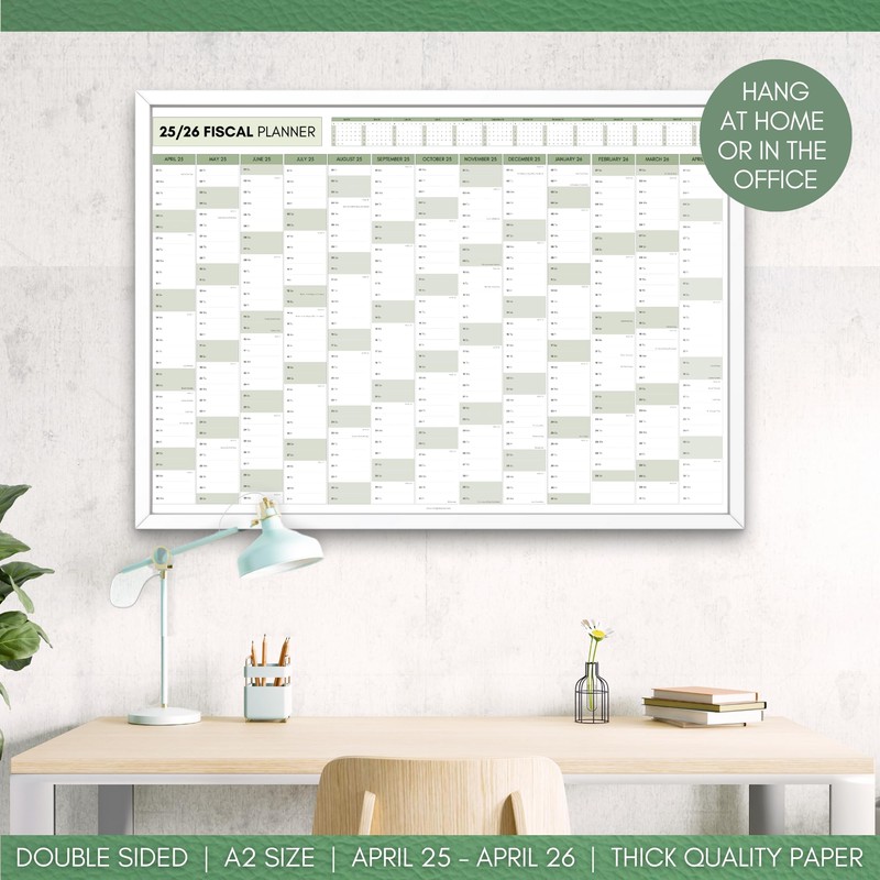 2025-2026 Fiscal Wall Planner, A2 60cm X 42cm | DOUBLE SIDED PRINT, Annual Financial Year Wall Calendar 2025 2026, Year Planner, Full Year to View | Organiser for Office, University, School (Green)