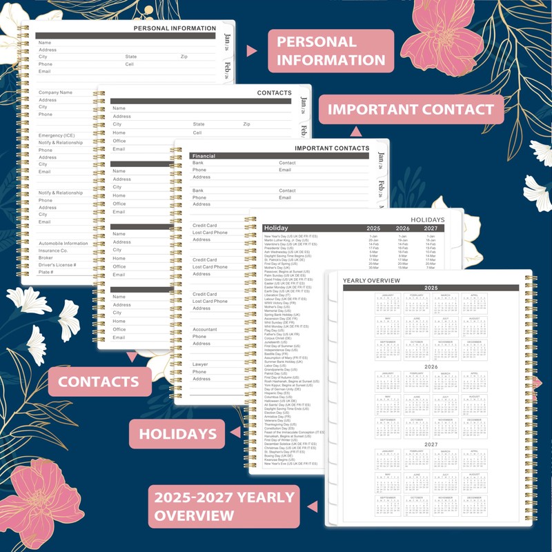 - 🌸 Specialties - 9" x 11" Monthly Calendar Planner Pages | 4 Important Contacts Pages | 2-year Monthly Calendar Pages | 6 Contacts Pages | 4 Passwords Pages | 3 Notes Pages | 2025-2027 Yearly Overview & Holidays | Golden Stamping Cover |Premium Paper | Spiral Bound | Monthly Tabs| Double-Size Pocket |.