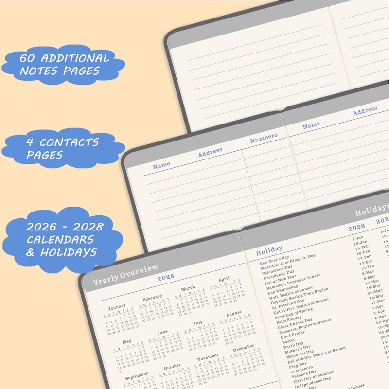 - 📖 ENHANCED ORGANIZATION - Past and future monthly referencing + Notes column in monthly page + 2025-2027 calendar overview + 2025-2027 holiday pages + 4 contact pages + 60 notes pages.
