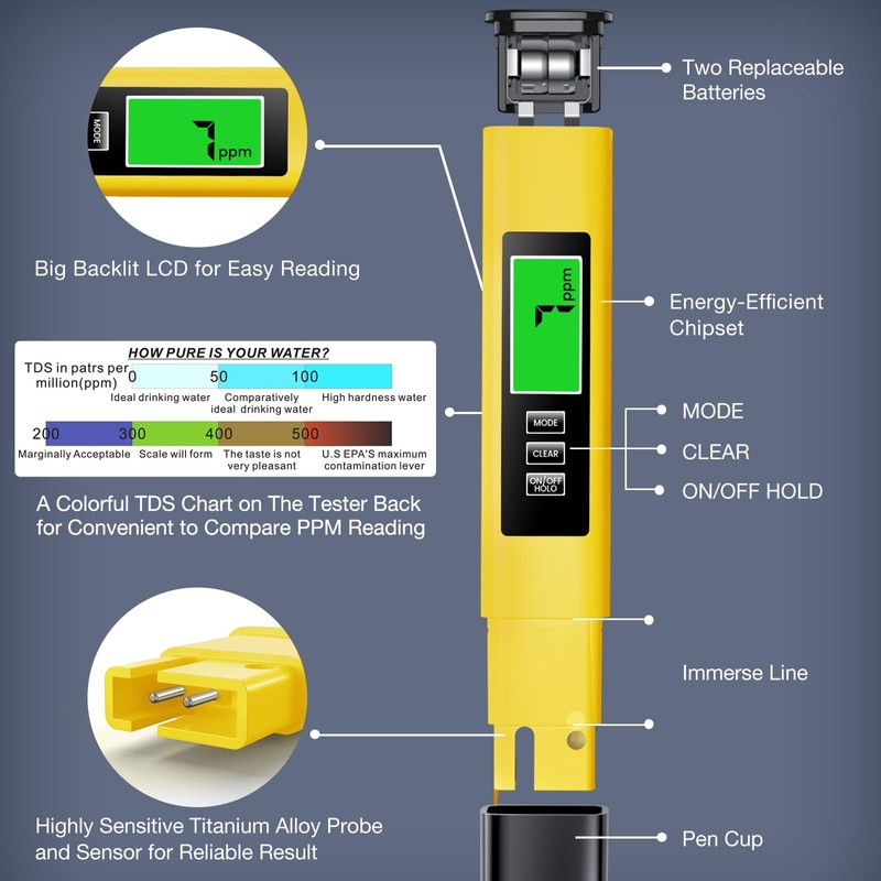 • Two User-Friendly Features:1. 25% Larger Backlit LCD: The MEXYBE 2024 4-in-1 water quality tester has a screen that's 25% bigger than older 3 in 1 models the market, making it easier to read for everyone, including seniors and children. 2. Convenient TDS Chart: A colorful TDS chart is placed on the back of the tester and in the user guide, so you can quickly understand PPM values without searching online—saving you time with every test