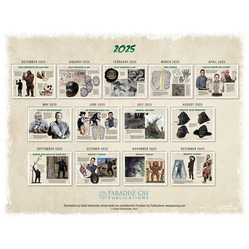 • Author-illustrator and Bigfoot researcher Slade Delastrode: Get insights from a true expert in the field. Slade Delastrode brings his extensive knowledge and experience to this Bigfoot and cryptid calendar.