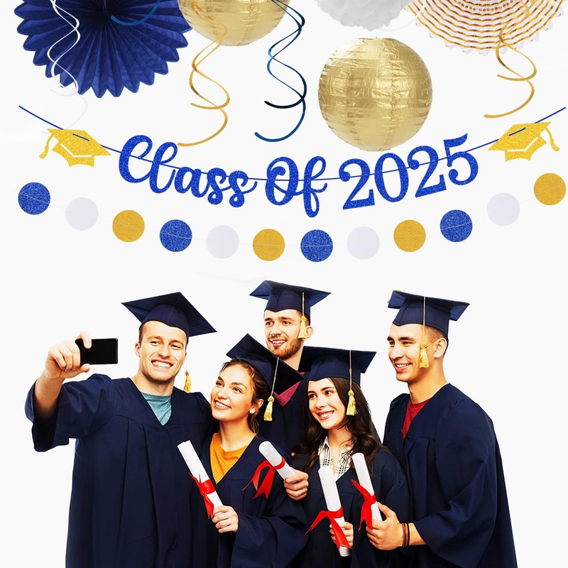 2025 Class Graduation Party-Decorations Banner-Streamers - 21pcs Navy Blue White Gold Congratulations Grad Backdrop Decor,Tassel Garland,Tissue Pom Poms Honeycomb,Paper Lantern Fans Hugtmr