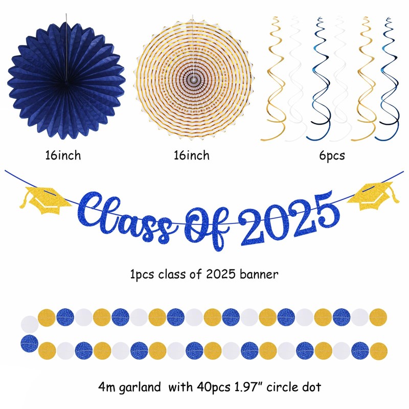 - Package Including:The navy-blue white-gold party decorations 1pcs paper garland dots,1pcs class of 2025 banner,1pcs Honeycomb ball,6pcs swirl streamers,1pcs 12” tissue pom poms,3pcs 8” tissue pom poms,4pcs 8” paper lantern,2pcs 12”paper lantern fan in three color,2pcs 16”paper lantern fan.