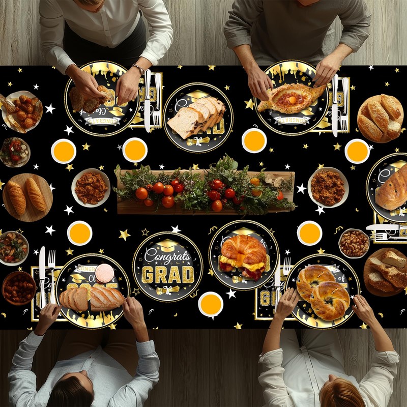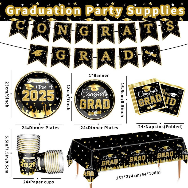 - 2025 Graduation Party Supplies: For each graduation party tableware set, you will receive 24 dinner plates (9’’), 24 dessert plates (7’’), 24 napkins, 24 paper cups, 1pc banner and 1pc tablecloth (54*108’’). Making it perfect for your 2025 graduation decorations