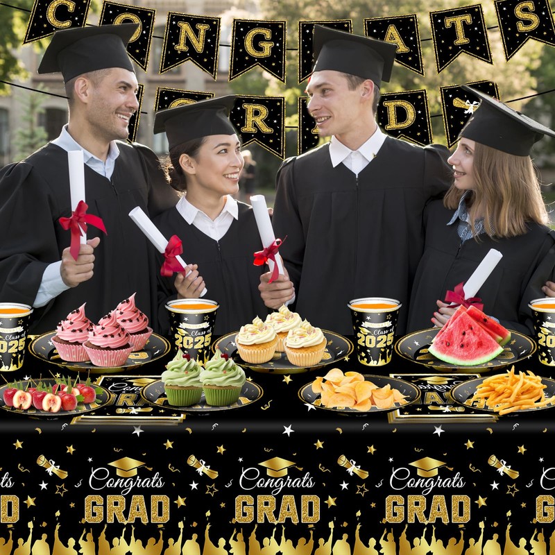 - Black and Gold Graduation Party Decorations: This graduation plates and napkins party supplies are perfect for 2025 graduation party, college, high school event and so on. Graduation party supplies use graduation season elements to make the design more attractive and exquisite. It can help you add a graduation party atmosphere to your event and let graduates feel the joy of graduation