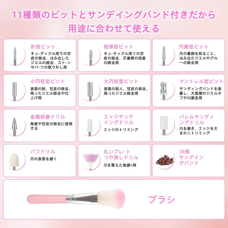 - ※※※※※よくあるご質問※※※※※ Q.ネイル初心者ですが、簡単に使えますか? A.はい。初めての方でも簡単に使えるよう、イラスト付きマニュアルと解説動画をご用意していますので安心してお使い頂けます。 Q.ジェルネイルをオフするにはどのビットを使いますか? A.セラミックビットを中心にお使い下さい。 Q.甘皮の処理と爪の形を整えるのに使いたいですが、初心者でも問題無く使えますか? A.初めての場合には速度をゆっくりにして少しづつ様子を見ながらお使い下さい。 Q.充電式でしょうか? A.充電可能です、800mAh容量電池内蔵. Q.使用後のお手入れはどうしたら良いでしょうか? A.アルコール除菌シートなどでキレイに拭いて下さい。