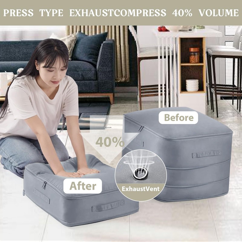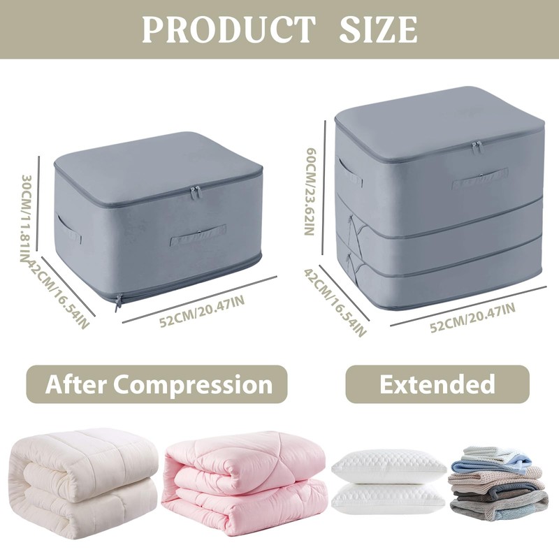 - 【Large Capacity】 With a generous size, this compression bag is perfect for storing bulky items like comforters, blankets, and duvets. The semi-rigid design prevents collapsing, making stacking effortless. Ideal for closets, basements, lofts, or luggage—maximize storage in stylish gray