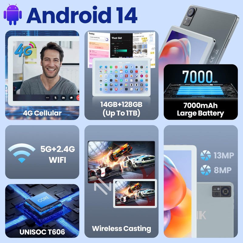 Qukenk 2025 New Android 14 Tablet 4G Cellular 14GB RAM(8+6 Virtual)+128GB ROM+1TB Expandable, 5G WiFi Tablets 10.1 Inch Incell HD Screen, 2 in 1 Tableta Octa-Core 7000mAh, Bluetooth 5.0/GPS/13MP+8MP
