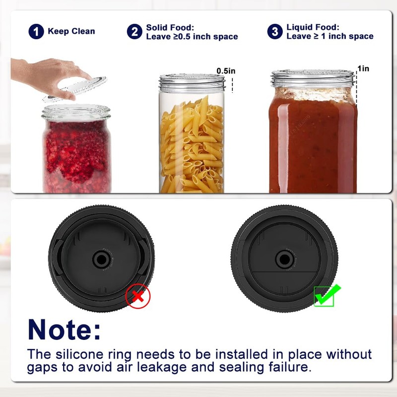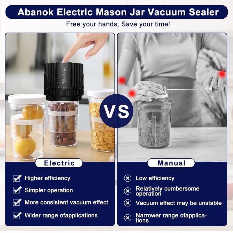 - Long-term Food Fresh Saver:Use in confidence, Abnaok electric mason jar vacuum sealer is made of ABS plastic and food-grade silicone, you can use to extract the air from your mason jars. Our mason jar electric vacuum sealer can extend freshness, and reduce food waste.