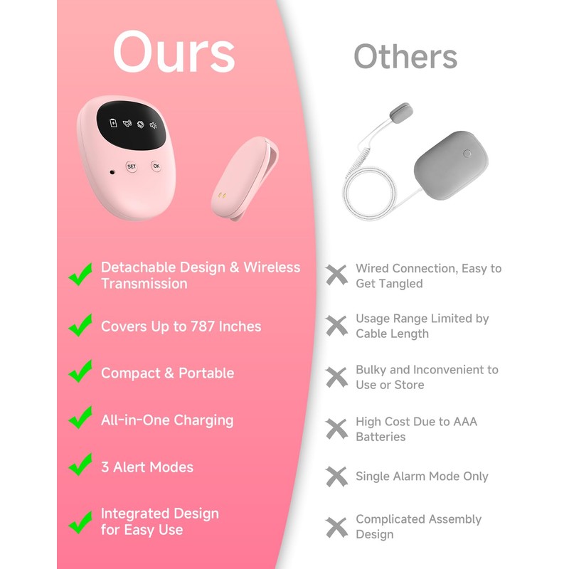 - đź§©[Wireless & Comfortable Design]: Unlike traditional alarms, this pee alarm for bedwetting uses a wireless transmitter, eliminating discomfort and safety risks associated with tangled wires. The transmitter has a range of 787 inches, allowing your child to move freely while sleeping without disturbing their rest.