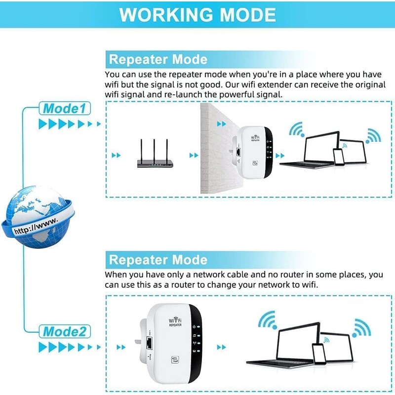 - 【Supports 2 Modes】Wi-Fi Extender has Ethernet Ports with Repeater/AP, can easily turn your wired Internet connection into a wireless access point.most home users will set it up in one of two ways: Range extender (it connects to your existing wireless network wirelessly and enhances/extends the signal) or Access Point (it connects to the Internet or your existing network via Ethernet and then broadcasts the wireless signal .