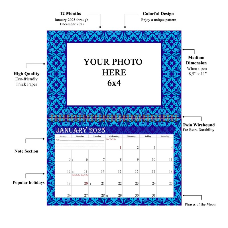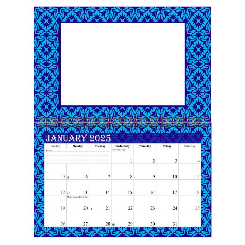- Photo Frame Calendar Measures approximately 8.5 inches by 5.5 inches (8.5 x 11 Inches Open) Inches Monthly Calendar Views - The calendar starts from January 2025 to December 2025 Calendar has 13 pages, 1 per month also has 1 page 2026 Reference Calendar - The calendar can either lay flat on a desk or hang it on the wall