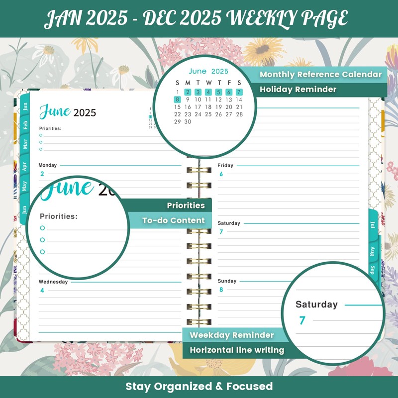 - 💖 2025 Planner - This 2025 planner weekly and monthly covers 12 months from January 2025- December 2025. The size is 6.4" x 8.5", comfortable to carry and use. Provide 12 monthly tabs dividers for an easier year-round tracking and quickly access.