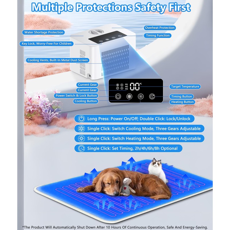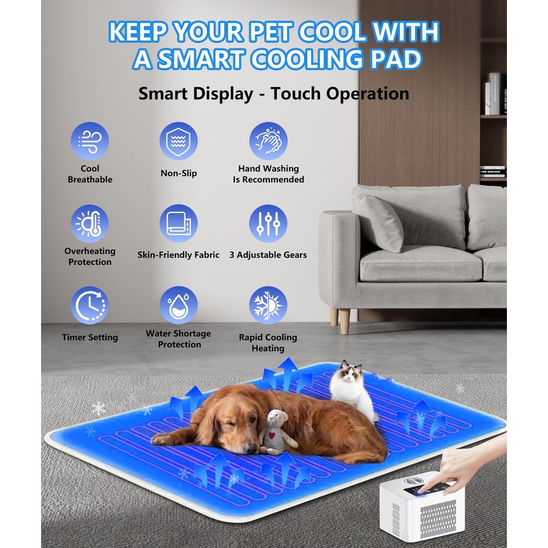 - 𝐏𝐞𝐫𝐟𝐞𝐜𝐭 𝐟𝐨𝐫 𝐌𝐮𝐥𝐭𝐢-𝐏𝐞𝐭 𝐇𝐨𝐦𝐞𝐬: Is your dog overheating? This Cooling Dog Bed lowers temps to 59°F in 15 minutes! Perfect for large breeds, this Cooling Mat for Dogs has a leakproof design, chew-resistant cords, and a safety lock. This 2-in-1 Smart Cooling & Heating Pad works for dogs AND cats. The ultra-quiet operation (<25dB) won’t disturb naptime, and the lining prevents odors. Use it as a stand-alone Dog Cooling Mat or pair it with a crate for all-day comfort! Every pet deserves their own cozy Cooling Dog Bed