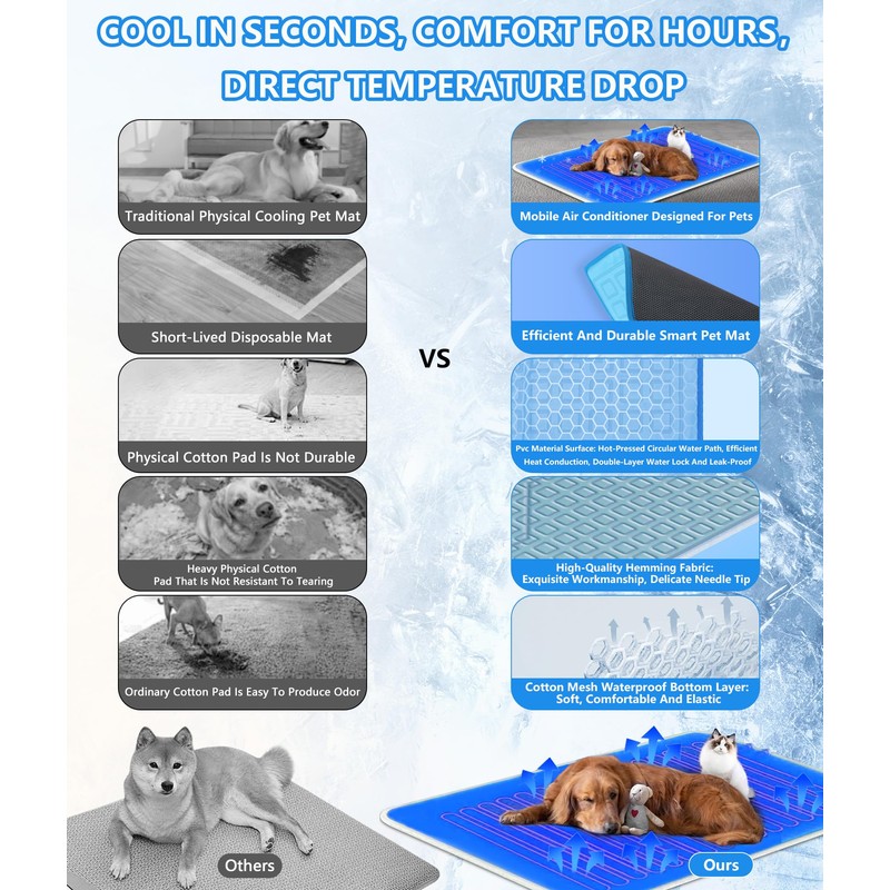- 𝐄𝐚𝐬𝐲-𝐂𝐥𝐞𝐚𝐧 & 𝐔𝐥𝐭𝐫𝐚-𝐃𝐮𝐫𝐚𝐛𝐥𝐞 𝐂𝐨𝐨𝐥𝐢𝐧𝐠 𝐒𝐨𝐥𝐮𝐭𝐢𝐨𝐧: No more stinky, hard-to-clean pet mats—this Dog Cooling Mat is waterproof, odor-resistant, and machine-washable! 🧼 The leak-proof design ensures no spills, while the quick-dry fabric stays fresh. The non-toxic cooling gel is safe for chewers, and the heavy-duty stitching withstands digging. Choose from 3 cooling levels (59°F/64.4°F/69.8°F) and relax knowing the auto-shutoff prevents overheating. The perfect Cooling Mat for Dogs—easy to maintain, built to last!
