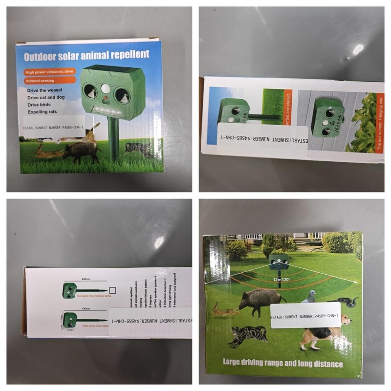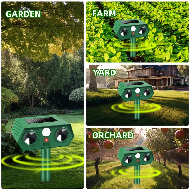 - Humane & Effective Animal Repellent:Uses motion detection to emit ultrasound and LED red light, effectively driving animals away