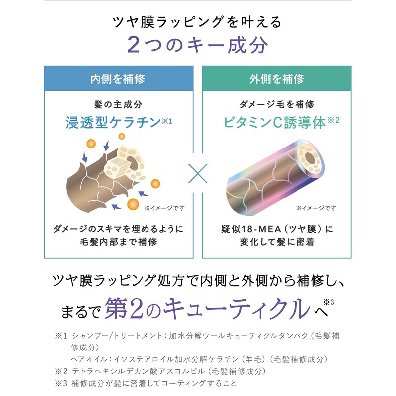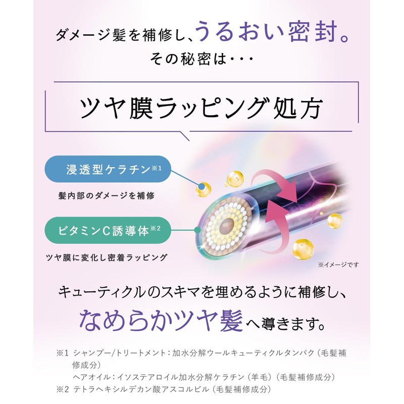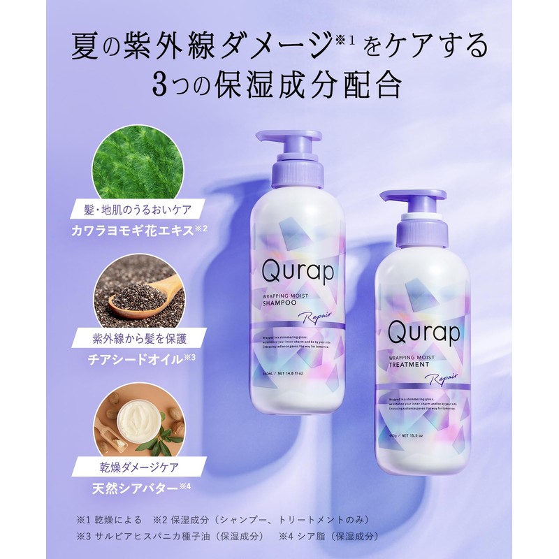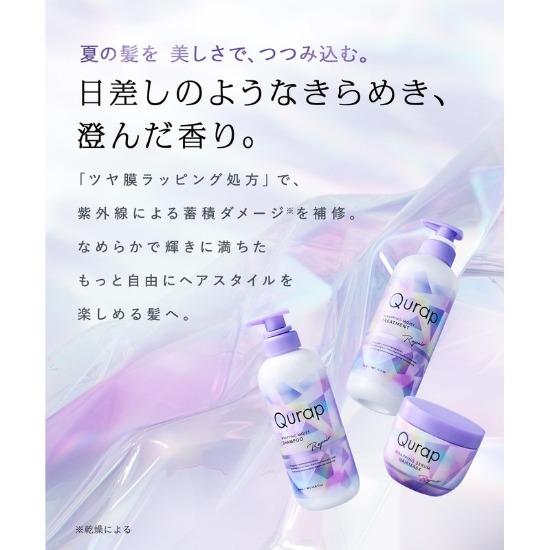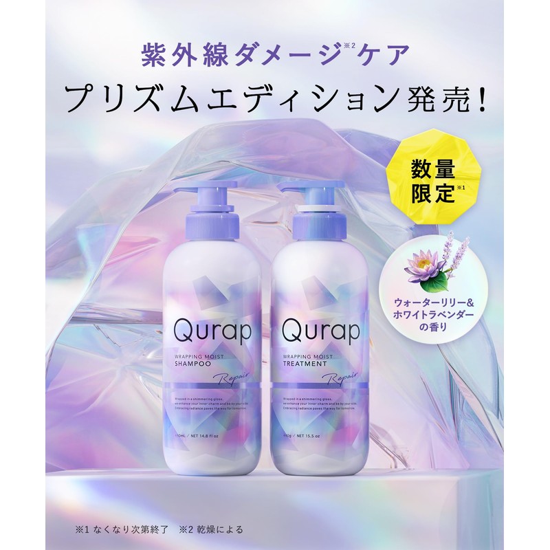 ■Qurap 企画品シリーズ:プリズムエディション <シリーズコンセプト> 夏の日差しのようにきらめき 美しさで包み込む 紫外線ダメージ※1ケア成分※2配合 夏の乾燥・パサつきも​ うるおい密封でぷるんツヤ髪へ​ 〇ツヤ膜ラッピング パサつきケア処方 浸透型ケラチン※3 髪内部のスキマを 埋めるようにダメージを補修 + ビタミンC誘導体※4 ツヤ膜に変化して 密着ラッピング 〇夏の紫外線乾燥ダメージをケアする成分配合 ・カワラヨモギ花エキス※5 ・天然シアバター※6 ・チアシードオイル※7 〇みずみずしい爽やかさをまとった ウォーターリリー&ホワイトラベンダーの香り ※1 乾燥による ※2 カワラヨモギ花エキス、シア脂、サルビアヒスパニカ種子油(保湿成分)​ ※3 加水分解ウールキューティクルタンパク(毛髪補修成分) ※4 テトラヘキシルデカン酸アスコルビル(毛髪補修成分) ※5 保湿成分 ※6 シア脂(保湿成分) ※7 サルビアヒスパニカ種子油(保湿成分)