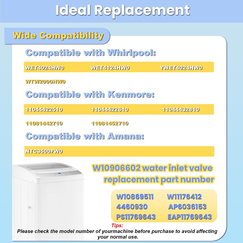- 【Widely Compatible】 The W10906602 water inlet valve is compatible with Whirlpool model WET4024HW0 YWET4024HW0 WET4124HW0 WTW2000HW0, compatible with Kenmore model 11044422510 11044422610 11044432810 11081442710 11081452710, Amana model NTC3500FW0
