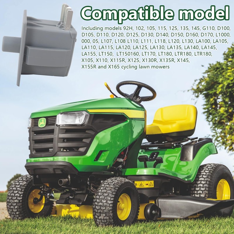 Fit for John Deere: 92H, 102, 105, 107H, 107S, 115, 125, 135, 145, G110, D100, D105, D110, D120, D125, D130, D140, D150, D160, D170, L100, L105, L107, L108, L118, L120, L130, L111, L118, L120, L130, LA105, LA110, LA115, LA125, LA130, LA135, LA145, LA155, LT150, LT160, LT180, LT190, LTR180, X105, X110, X115R, X125, X130R, X135R, X145, X155R and X165 lawn tractors
