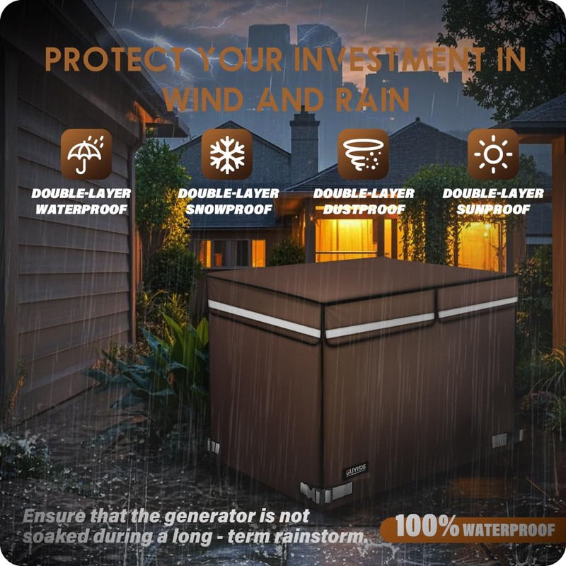 - 【Double-layer Waterproof & Tear-resistant】The GUYISS generator cover is made of double-layer waterproof fabric and has strong tear-resistant performance. The outer fabric is made of heavy-duty 900D waterproof Oxford cloth, while the inner fabric adopts a 210D heat-reflective lining. It can not only achieve 100% waterproofing but also reduce internal heat absorption and equipment wear.