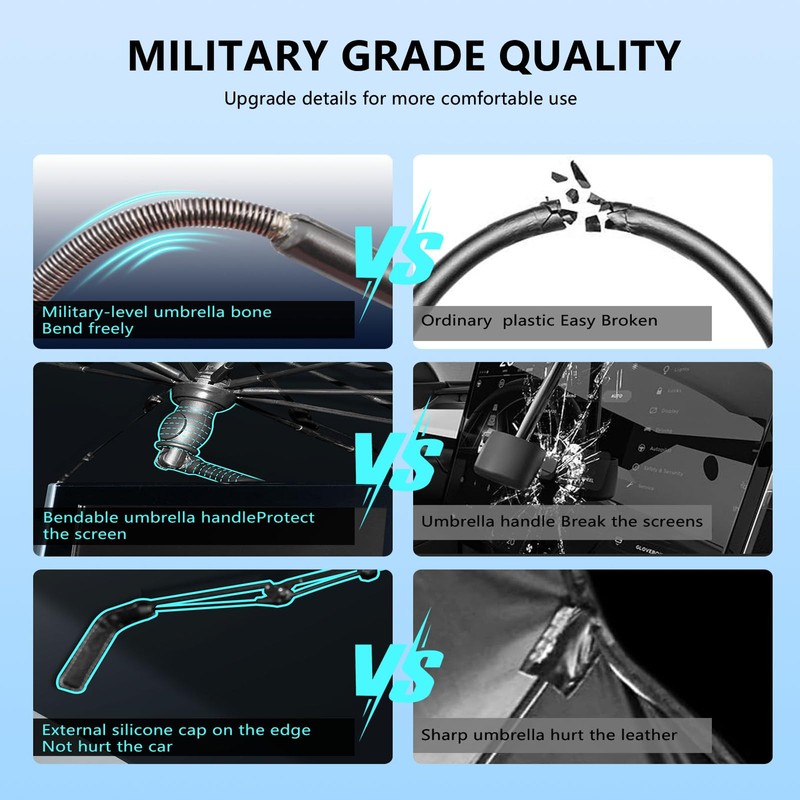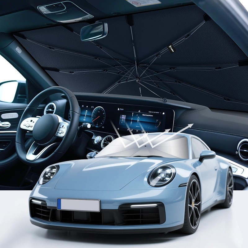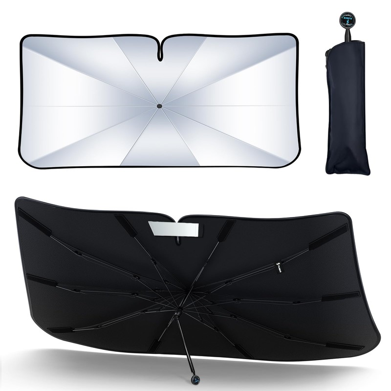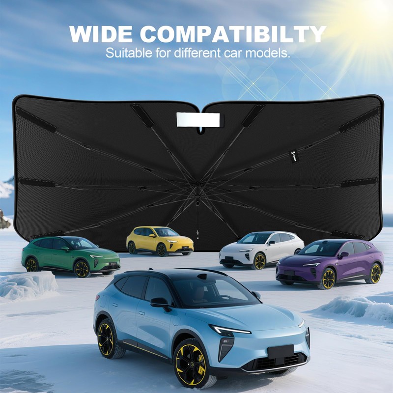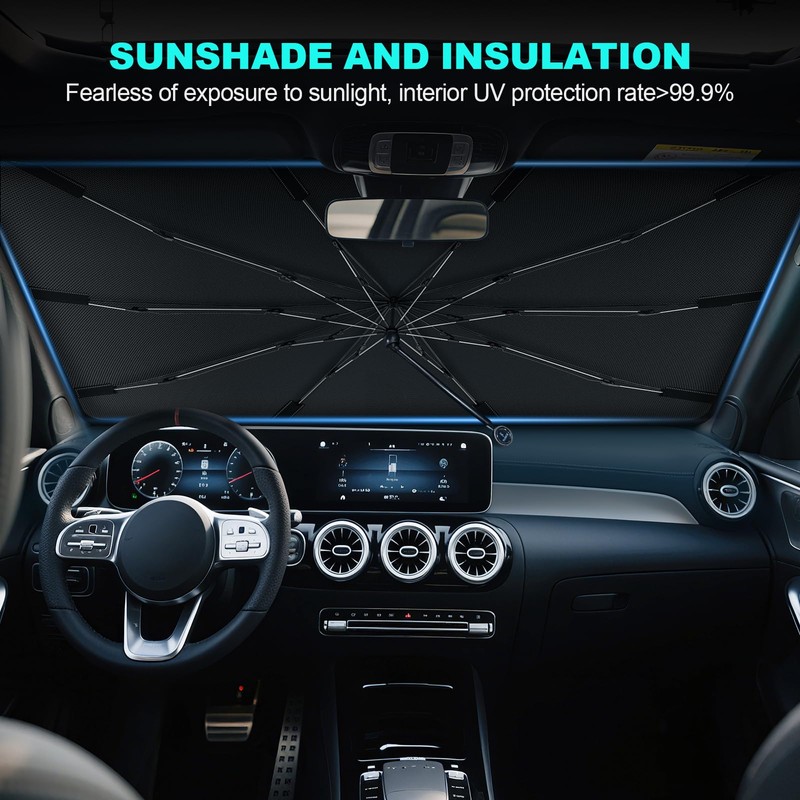 - 2025 updated car windshield Sunshade Umbrella. Featuring our innovative ice crystal cooling material, it evenly distributes heat across the umbrella, mitigating the sun's intense heat. Keep your car's interior at a comfortable 90 degrees Fahrenheit, ensuring a cool, enjoyable ride.