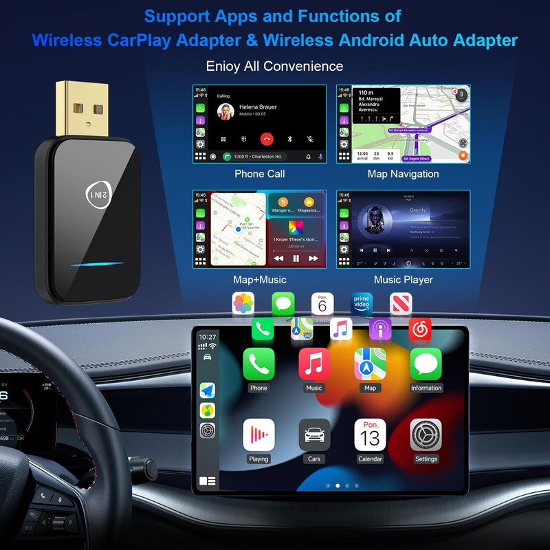 - đăEffortless Wireless CarPlay / Android Auto ExperienceăThe Apple Car Play Wireless Adapter works with any car that supports wired CarPlay/Android Auto, converting wired to wireless without the need for complicated setup and getting rid of those pesky cables in seconds. The Mini android auto wireless adapter supports navigation, music playback, Siri Assistant, phone calls, text messages and more, so you can enjoy the full functionality of CarPlay!