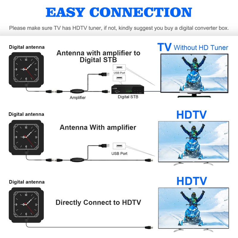 - 【Premium Coaxial Cable】HIDB TV Antennas includes standard coax cables with stronger copper wiring, with loss of signal decreased by 50 percent for a 120 mile reception radius from your home. This durable construction removes signal interference, bringing superior HD reception and powerful signal reliability.