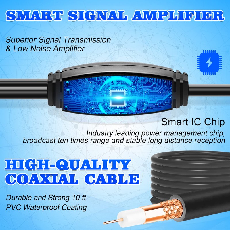 2025 Upgrade TV Antenna Indoor Long Range, Supports 4K 1080p Smart TV Signal Reception with Signal Amplifier 16ft HDTV Coax Cable