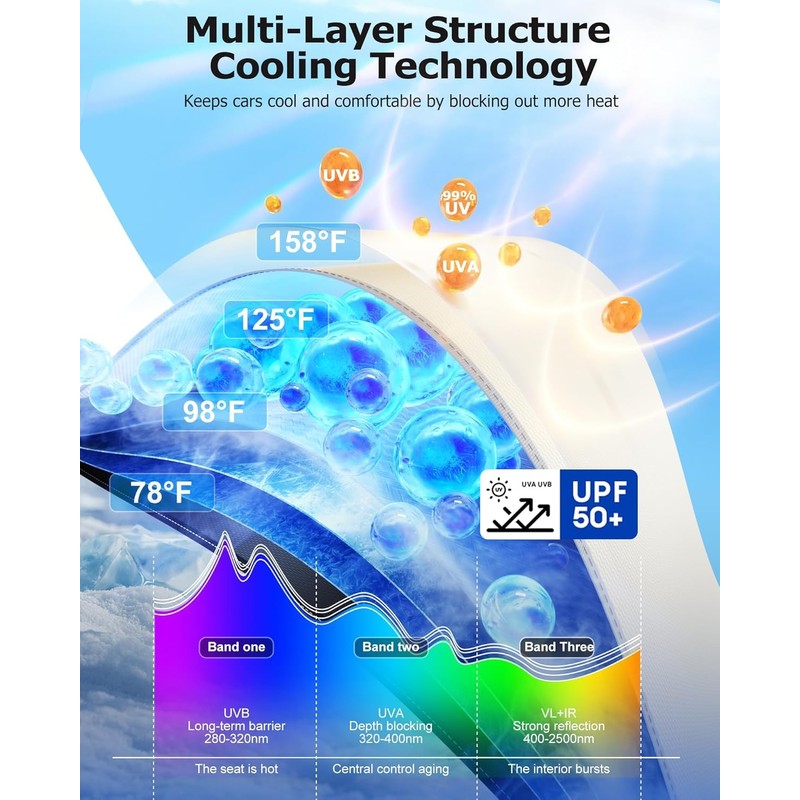 - [Ultimate Cool & Comfortable] The 2025 Upgraded Car Sunshade allows you to experience the ultimate cool and comfortable driving experience this summer. It is made of advanced polyurethane coated material that protects against 99% of UV rays. The interior aerogel construction prevents heat transfer and keeps the interior temperature at a comfortable 90 degrees Fahrenheit. Get ready for a great drive!